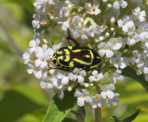 The Fiddler Beetle (Eupoecila australasiae) is named for the striking violin shaped markings on its back. It is harmless, feeding on nectar from flowering plants. It lays eggs in rotting wood or damp ground, where the grubs develop feeding on the rotting wood.